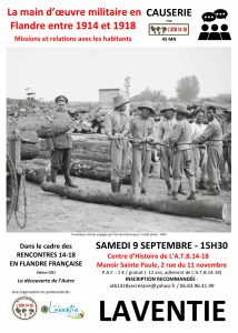 Le 9 septembre, une exposition est présentée au Manoir Sainte Paule de 14H à 17H. A cette occasion, une causerie thématique sera donnée à 15H30 sur le thème de la main d’œuvre militaire entre 1914 et 1918.